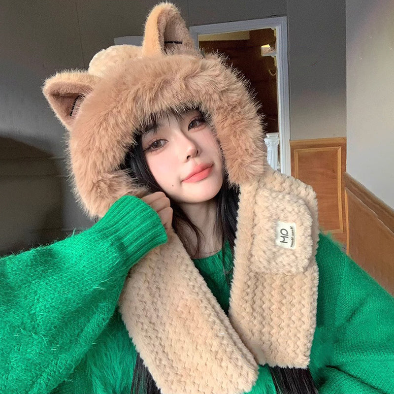 Accesorio combinado que integra gorro y bufanda en una sola pieza para cubrir cabeza y cuello durante el frío. Incluye un diseño decorativo con orejas en forma de zorro. La talla única se adapta tanto a adultos como a niños.