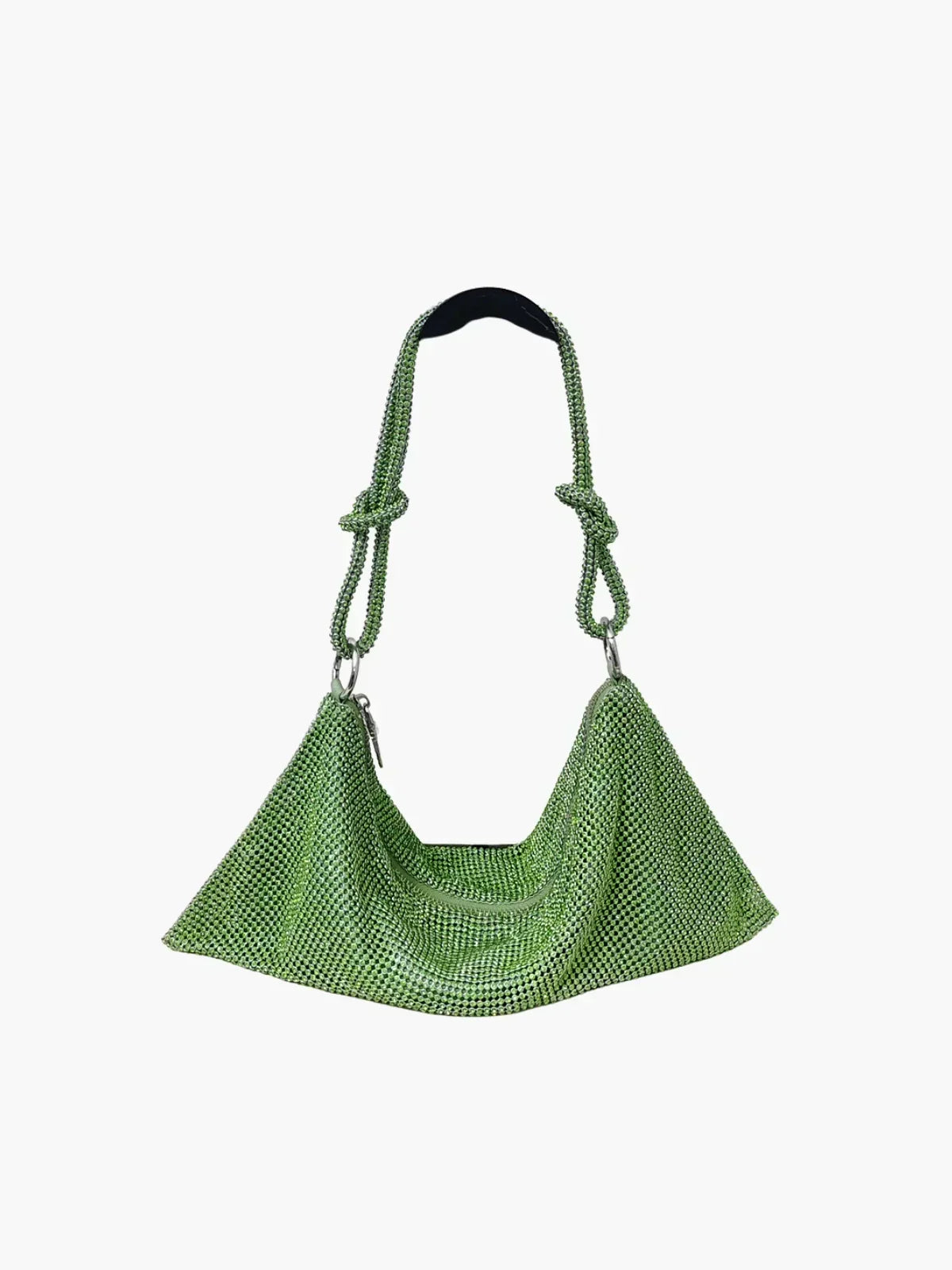 Este bolso de hombro compacto está diseñado para transportar objetos personales esenciales durante salidas en la noche. Su compartimento principal permite organizar los artículos necesarios de forma práctica. La asa anudada única permite llevarlo en la mano o al hombro según la necesidad.