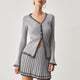 Conjunto de dos piezas compuesto por un cárdigan ajustado y una falda plisada a juego, diseñado para uso coordinado. El cárdigan incluye cierre frontal con botones y escote en V, mientras que la falda presenta un diseño plisado de largo regular. Las rayas en contraste definen los bordes de ambas piezas y permiten un uso conjunto o por separado.