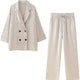 Este conjunto de dos piezas incluye un blazer de doble botonadura y un pantalón a juego con cintura elástica. La silueta fluida permite libertad de movimiento durante actividades laborales o informales. Las prendas pueden utilizarse juntas para un conjunto completo o combinarse por separado según la ocasión.