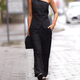 Conjunto de dos piezas compuesto por un top de un solo hombro y un pantalón de talle alto con pernera amplia. Está diseñado para usarse en eventos sociales, cenas y salidas informales durante la temporada de verano. Ambas prendas pueden utilizarse juntas como conjunto coordinado.