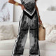 Conjunto de dos piezas compuesto por un top sin mangas con espalda descubierta y estampado geométrico, combinado con un pantalón de corte amplio. Diseñado para uso en días cálidos y actividades informales, permite ventilación en la parte superior y movilidad en la prenda inferior. Las piezas pueden utilizarse juntas o por separado según la ocasión.