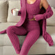 Este conjunto incluye un top sin mangas, un legging de talle alto y un cárdigan largo coordinado. Está diseñado para actividades cotidianas en interiores y para ofrecer una opción funcional para el uso en casa. Su forma ajustada permite un movimiento adecuado durante tareas diarias o momentos de descanso.