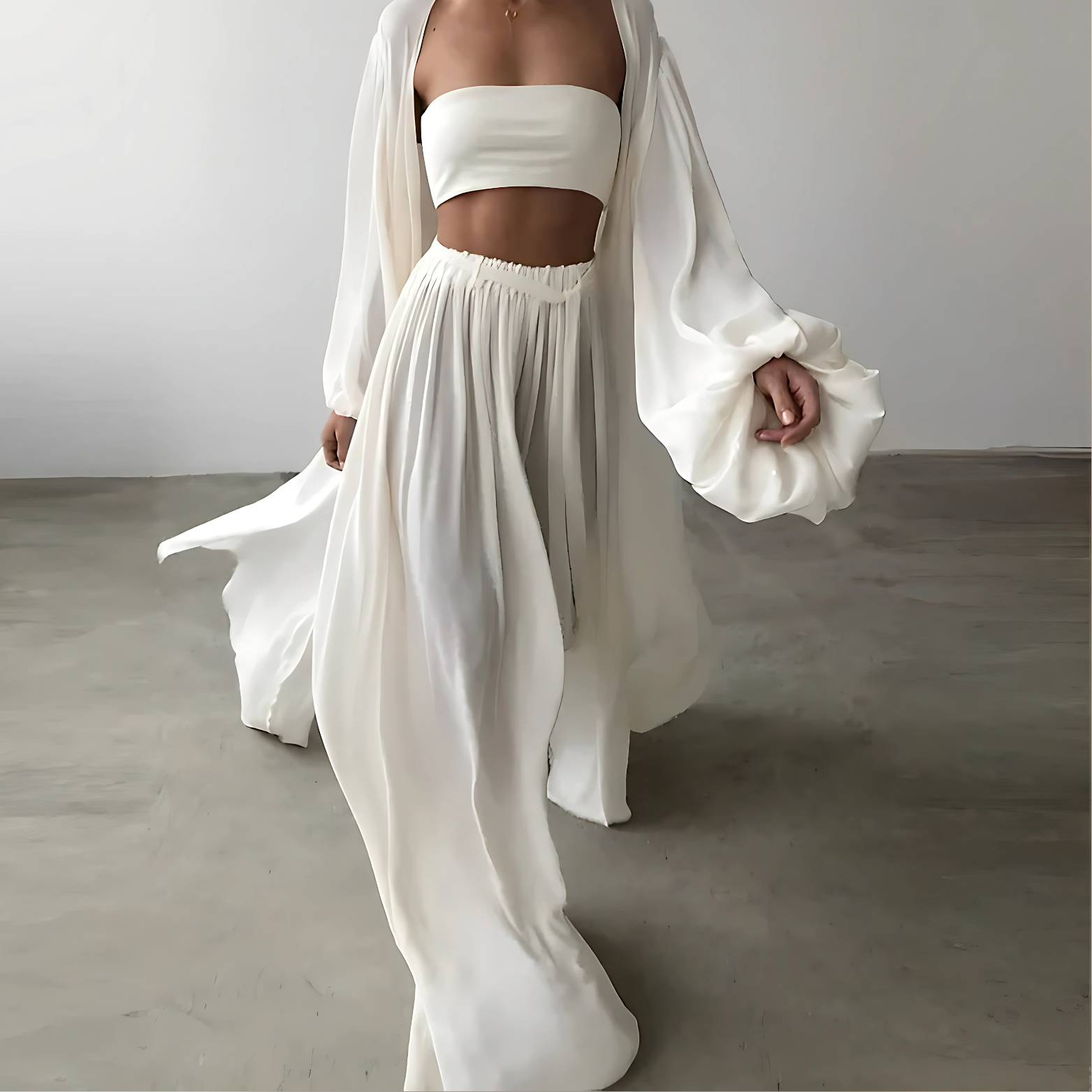 Este conjunto incluye un top sin mangas de corte recto, un pantalón de pierna ancha con cintura elástica y un chaleco abierto a juego. Las tres prendas están diseñadas con una estructura amplia para facilitar el movimiento en actividades cotidianas. Cada pieza puede utilizarse de forma conjunta o combinada por separado según la ocasión.
