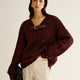 Este jersey para mujer presenta una estructura de punto con textura visible y un cuello en V decorado con una hebilla. Incorpora pequeñas perlas integradas en el tejido y tiene un corte amplio con mangas largas. Está diseñado para un uso cómodo durante los días frescos.