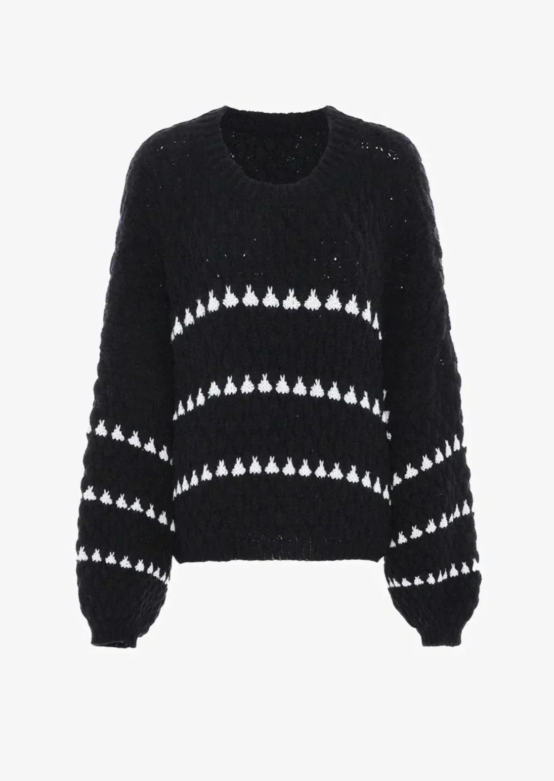 Este jersey de manga larga está diseñado para usarse durante las temporadas frías. Presenta una estructura de punto grueso con corte amplio y mangas tipo globo. Incluye un diseño tejido con detalles contrastados para un aspecto visual definido.